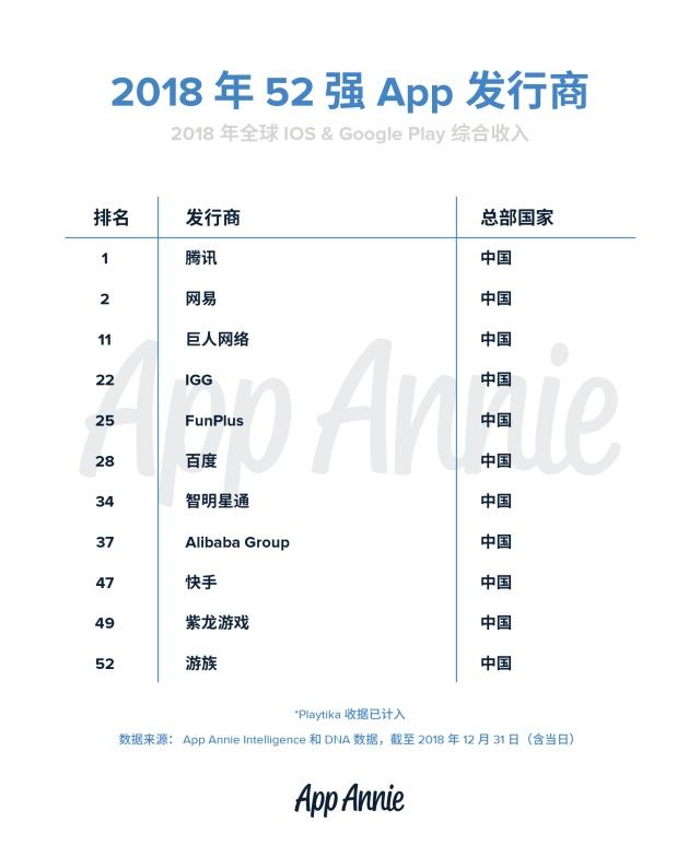 2月26日,全球移动数据和分析服务商 App Annie公布了 2018 年度“52 强发行商”榜单,评选出Google Play和iOS App Store两大App商店收入佼佼者。中国共有11家企业入围,知名游戏厂商游族网络位列其中,同时这也是游族网络连续第二年入围该榜单。