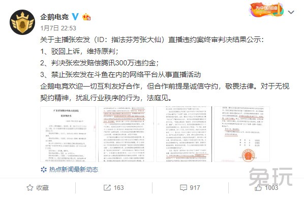 张大仙赔偿300万原因是什么?北京时间1月7日晚间,国内直播平台企鹅电竞通过社交媒体公布了一则终审民事判决书,备受关注的张大仙(张宏发)违约案终于告一段落。