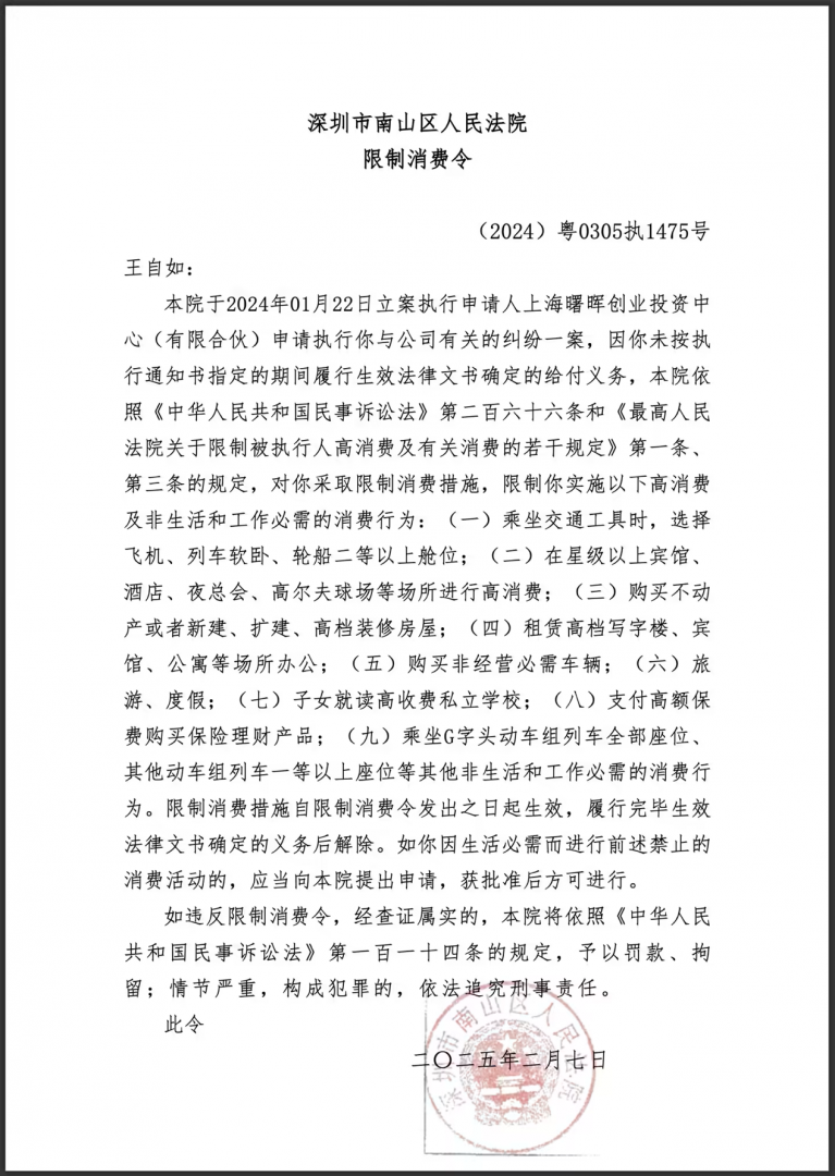 根据中国执行信息公开网的最新信息,2月7日,深圳市南山区人民法院对王自如签发了限制消费令。原因是王自如未能在执行通知书指定的期间内履行生效法律文书确定的给付义务,因此法院对其采取了限制消费措施,禁止其进行一系列高消费及非生活和工作必需的消费行为。