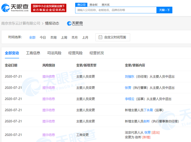 新浪科技讯 7月22日上午消息,天眼查数据显示,近日,南京京东云计算有限公司发生工商变更,刘强东退出总经理,张雱退出执行董事、法定代表人,均由赵彬接任。此外,李娅云退出监事,由丁永晟接任。