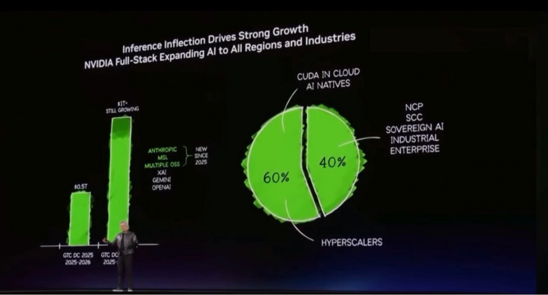 面对市场对AI芯片增长天花板的质疑,黄仁勋直言底气十足:“去年此时,我们预判Blackwell与Rubin芯片到2026年可实现5000亿美元高确信度需求;而此刻,基于产业爆发式增长的现实,我们将2027年的目标上调至至少1万亿美元。”