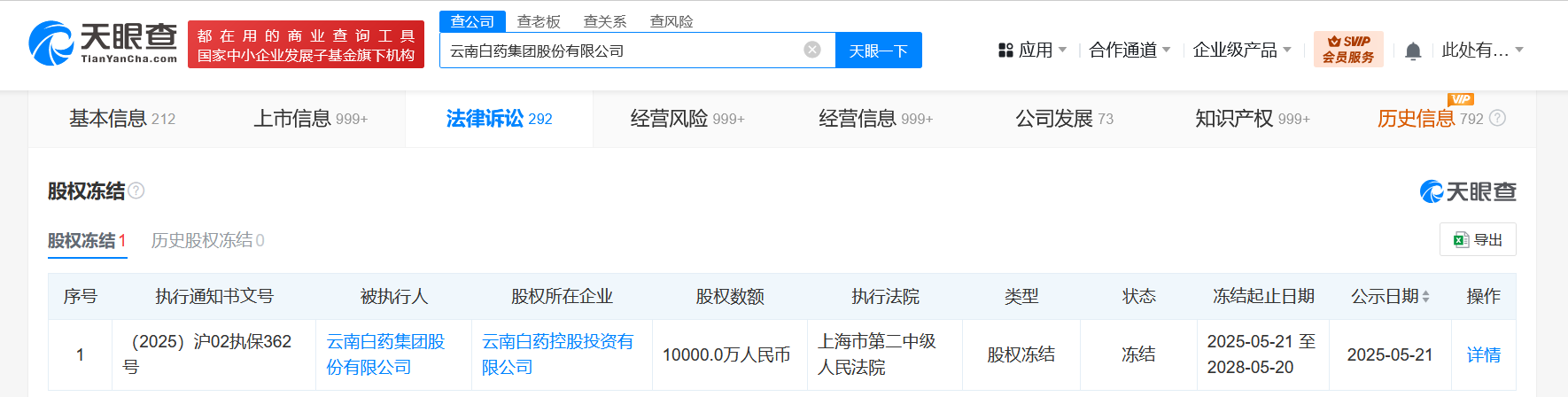 天眼查天眼风险信息显示,近日,云南白药(000538)新增一条股权冻结信息,股权被执行的企业为云南白药控股投资有限公司,冻结股权数额1亿人民币,冻结期限3年,执行法院为上海市第二中级人民法院。