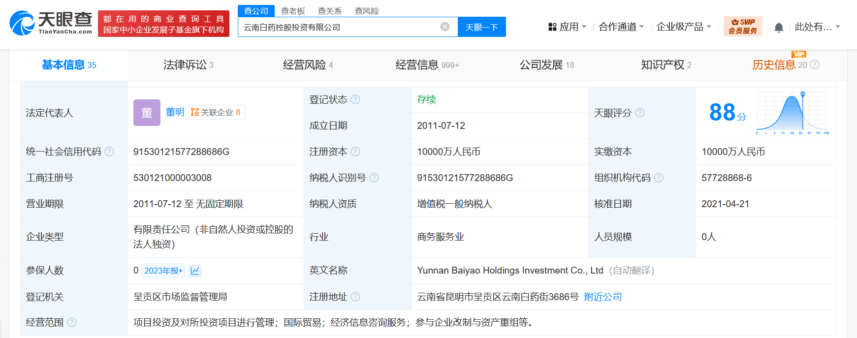云南白药控股投资有限公司成立于2011年7月,法定代表人为董明,注册资本1亿人民币,经营范围为项目投资及对所投资项目进行管理、国际贸易、经济信息咨询服务、参与企业改制与资产重组等,由云南白药集团股份有限公司全资持股。