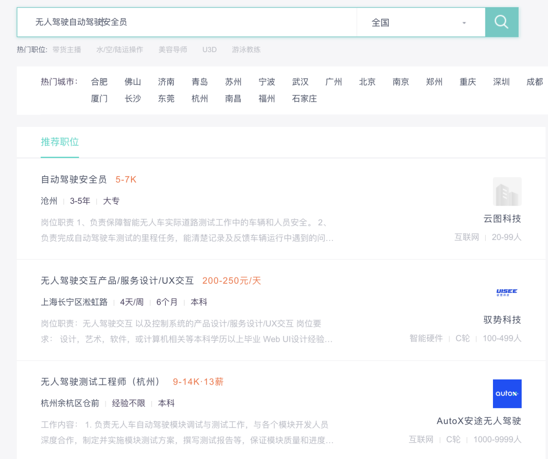 不仅仅是萝卜快跑,小马智行、文远知行、小米汽车、云图科技等多家企业都在招聘安全员等相关职位。