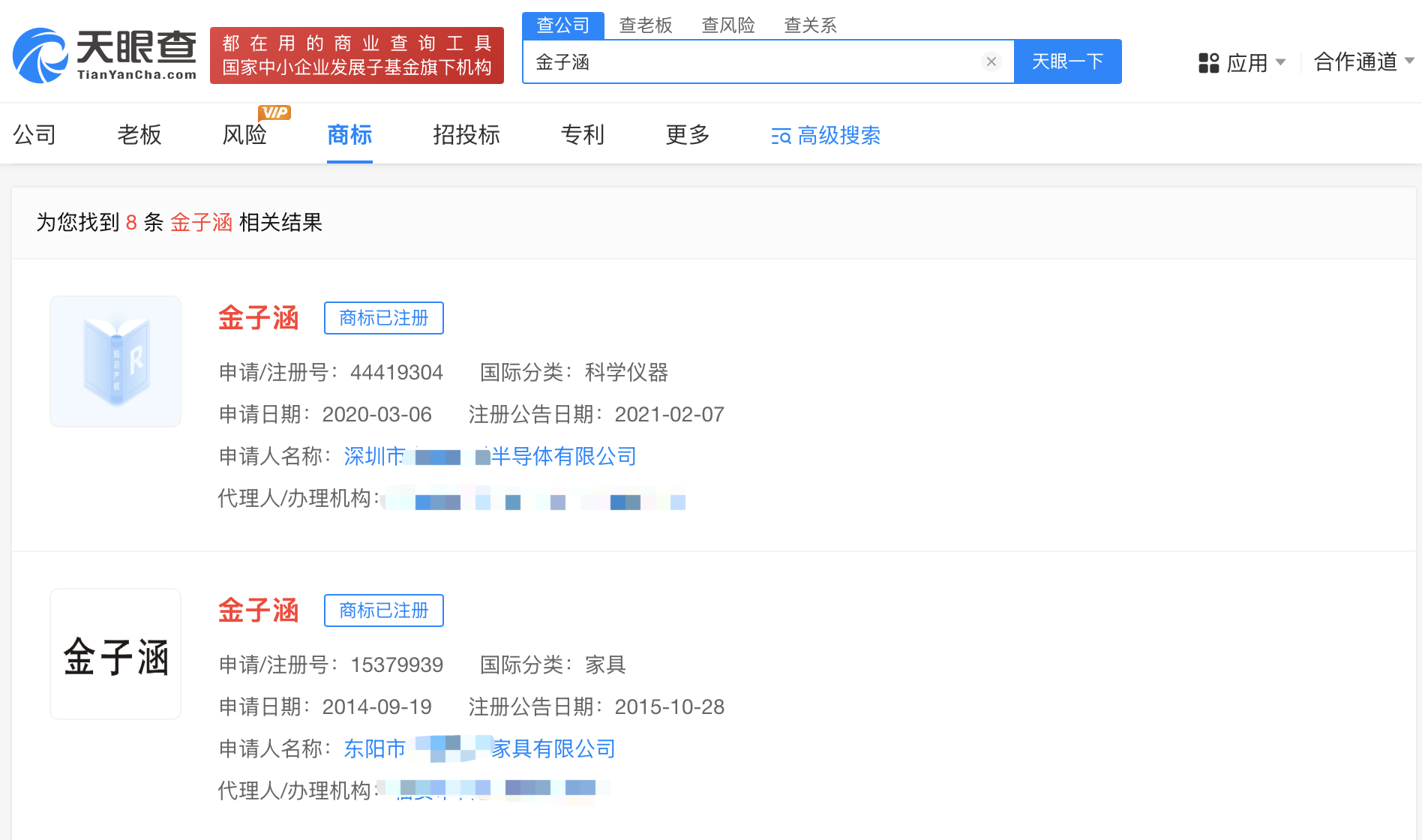 天眼查App显示,“金子涵”已被多方申请注册为商标,申请人包括深圳市某半导体有限公司、东阳市某家具有限公司等,国际分类涉及科学仪器、家具、皮革皮具等,当前商标状态多为已注册。