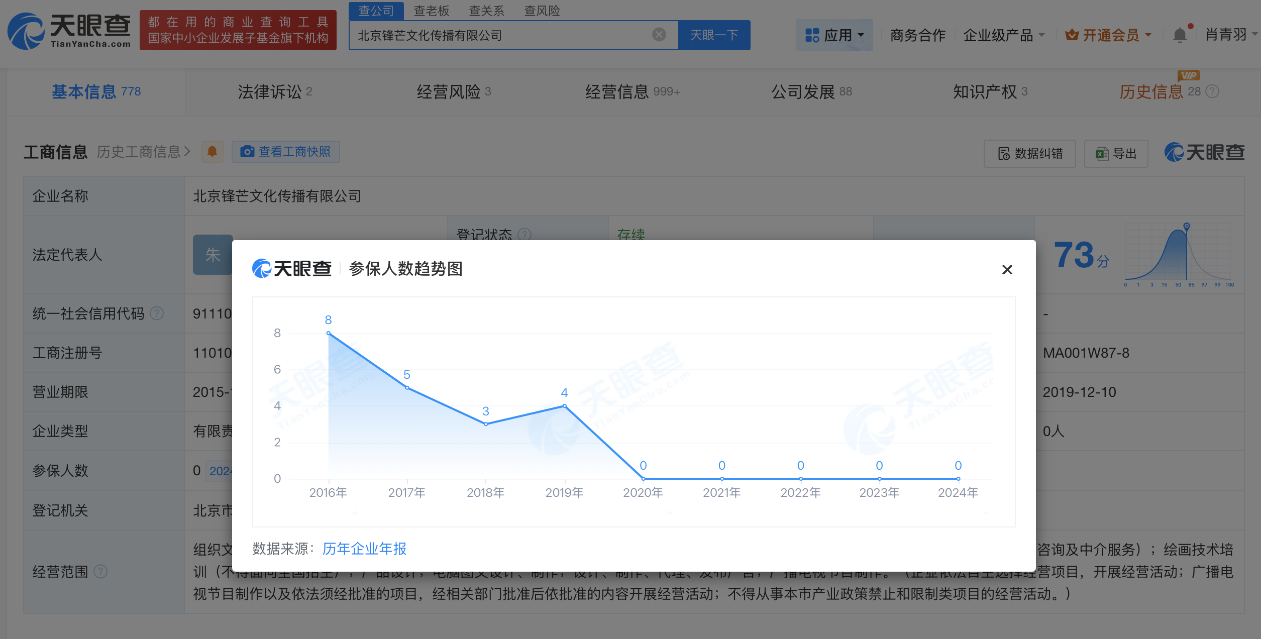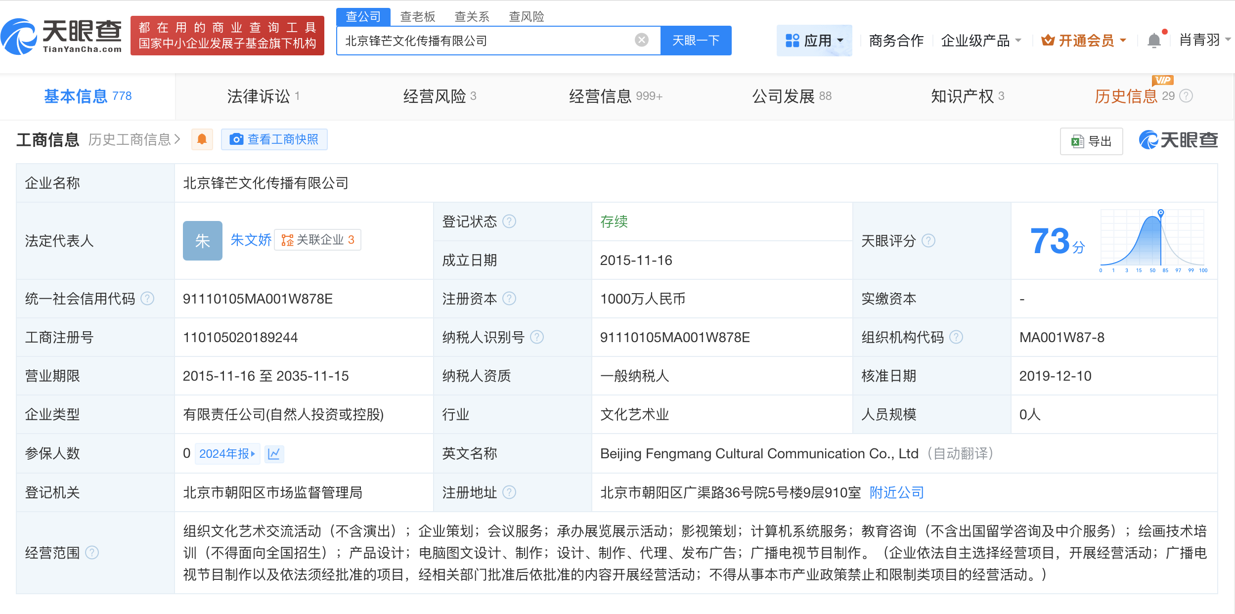 据柴鸡蛋主页显示,其为北京锋芒文化传播有限公司总经理,天眼查App显示,该公司成立于2015年11月,注册资本1000万,法定代表人、执行董事、经理为朱文娇,年报信息显示,该公司2020年至2024年参保人数均为0。天眼风险信息显示,2022年4月,该公司及朱文娇被限制高消费,涉及著作权许可使用合同纠纷,原告为深圳市腾讯计算机系统有限公司,涉案总金额达1250万。