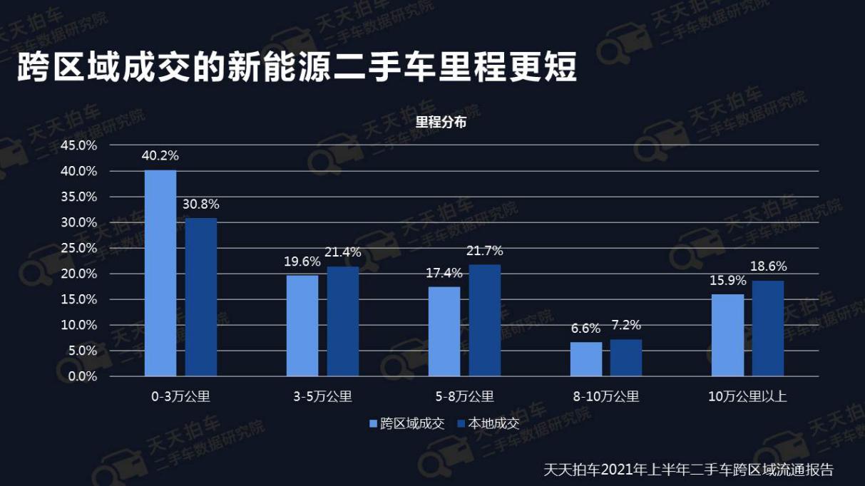 天天拍车数据显示,相较于本地成交的新能源二手车,异地成交的新能源二手车车龄3年以内最多,占比高达49.2%。和燃油车以3-8年车龄为主不同,在新能源二手车领域,车龄3年以内的“次新车”更受外地市场追捧。这是因为,新能源二手车更新迭代快,市场上的消费者们“追新”意识强;加之部分新车经销渠道供应不足,消费者很难买到现车,因此“次新车”成为性价比更高的替代方案。