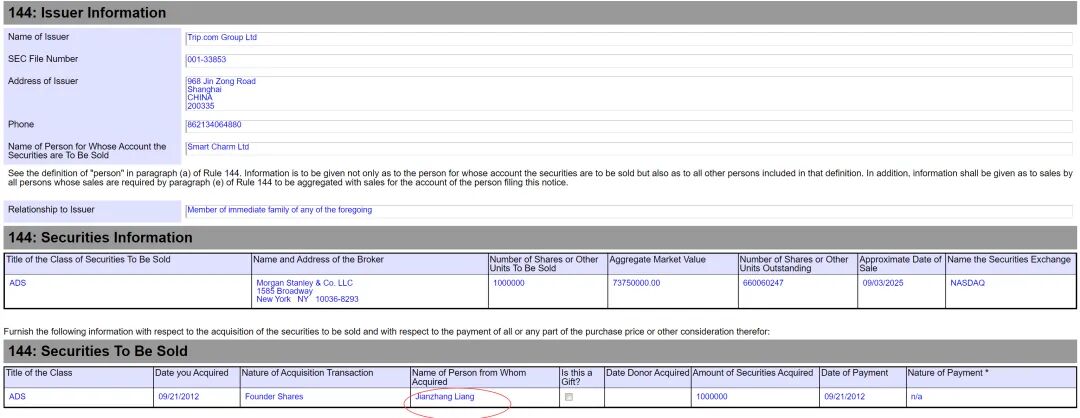 据携程递交给美国SEC的文件显示,携程联合创始人、董事局主席梁建章计划出售公司100万ADS,套现7375万美元(约5.27亿元人民币)。这则来自携程最新提交美国SEC文件的信息,在旅游市场复苏的背景下格外引人注目。