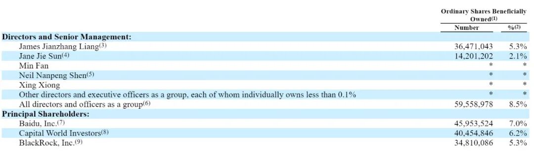 对比2024年的数据,百度持股比例从9.4%下降至7%,减少了2.4个百分点。梁建章持股比例反而从5%增加到5.3%,孙洁也从1.9%增至2.1%。