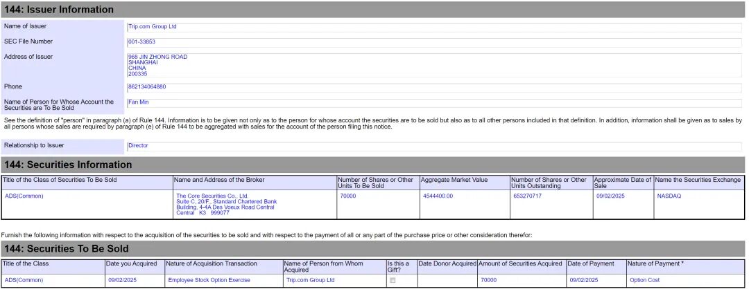 与此同时,携程联合创始人、总裁范敏也递交文件,计划出售7万股ADS,价值454.44万美元(约3242万元人民币)。加上今年5月的减持,范敏2025年以来累计套现达6200万元。