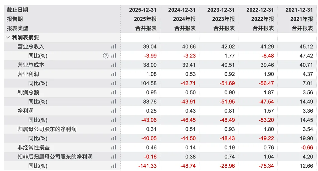 2025年延续了这一下滑趋势,营收进一步降至39.04亿元,净利润仅3086.63万元,同比大幅下降40.05%,扣除非经常性损益后的净利润为-1560.54万元,处于亏损状态,反映出公司核心业务增长乏力的问题日益凸显。