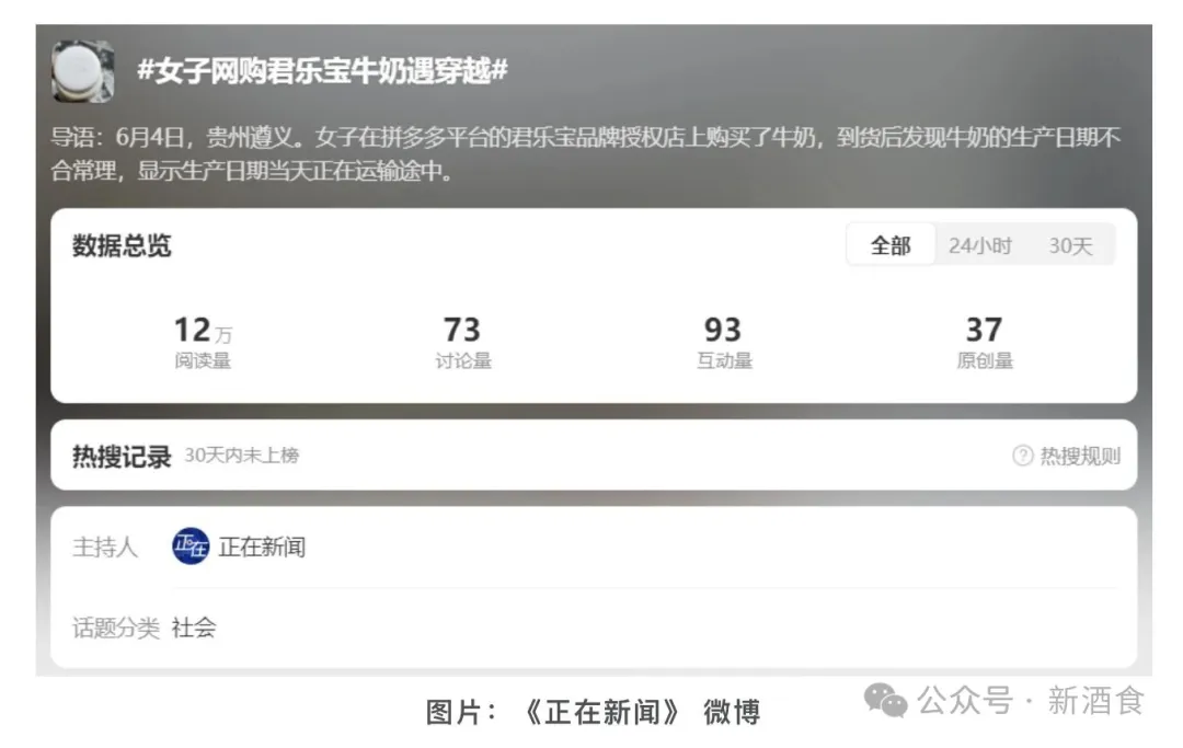 根据媒体报道,贵州遵义的闫女士在拼多多君乐宝授权店购物时,意外遭遇了离谱的“生产日期穿越”——她5月24日下单的悦鲜活牛奶,5月26日就已经有了物流的揽收、分拣和转运记录,27日显示已在运输中,而收到货物后却发现,瓶盖上的生产日期为5月27日、上市日期为5月28日。