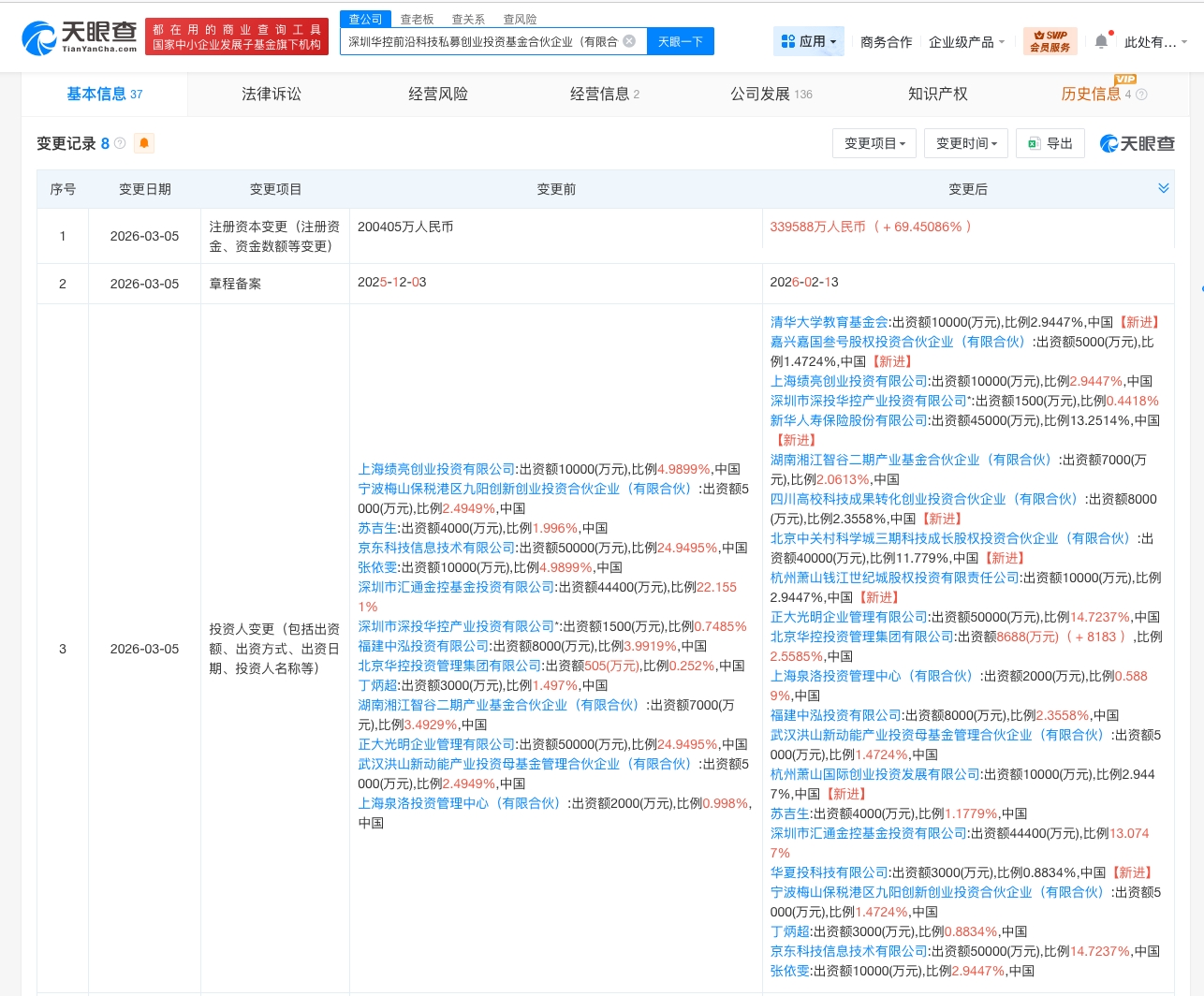 天眼查工商信息显示,近日,深圳华控前沿科技私募创业投资基金合伙企业(有限合伙)发生工商变更,出资额由约20.04亿人民币增至约33.96亿人民币,增幅约69%,同时新增北京中关村科学城三期科技成长股权投资合伙企业(有限合伙)、杭州萧山国际创业投资发展有限公司、新华人寿保险股份有限公司等8位合伙人。