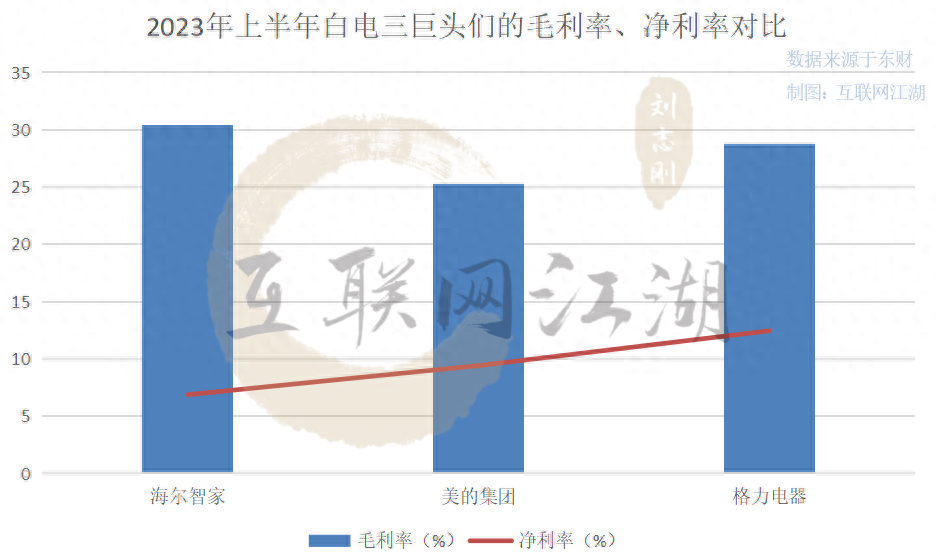 然而在这方面,虽然海尔智家的扣非净利增速惊人,毛利率更是在今年上半年达到了30.44%,高于同期美的、格力的25.24%和28.75%,但是紧接着,毛利率最高的海尔智家的净利率,相较于另外两家就变成了最低,仅为6.87%。其次是美的的9.41%,最高是格力电器的12.45%。