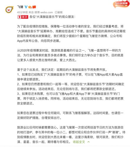 受疫情影响,飞猪表示,大漠赫兹音乐节。