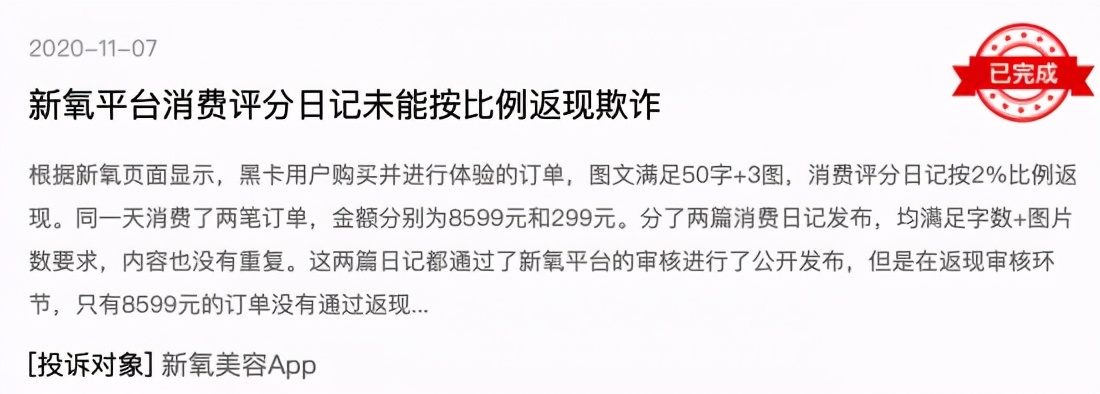 诸多消费者还表示,新氧的投诉称机构强制好评,称给医美机构好评可以返现5000,在医美失败后想要退款必须先删除差评,或是在差评后被删评、封号,消费者并不能从评价中找到参考意义。