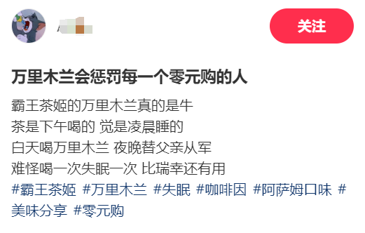 而这一次,万里木兰不负众望,再次举起了失眠大单品的旗子,且恐怕有过之而无不及。迅速,网上各种热梗频出:“喝万里木兰,品失眠人生”、“霸王茶姬会平等惩罚每一个0元购的人”、“下午喝木兰,晚上去从军”、“喝木兰,上阵杀敌更有劲”……