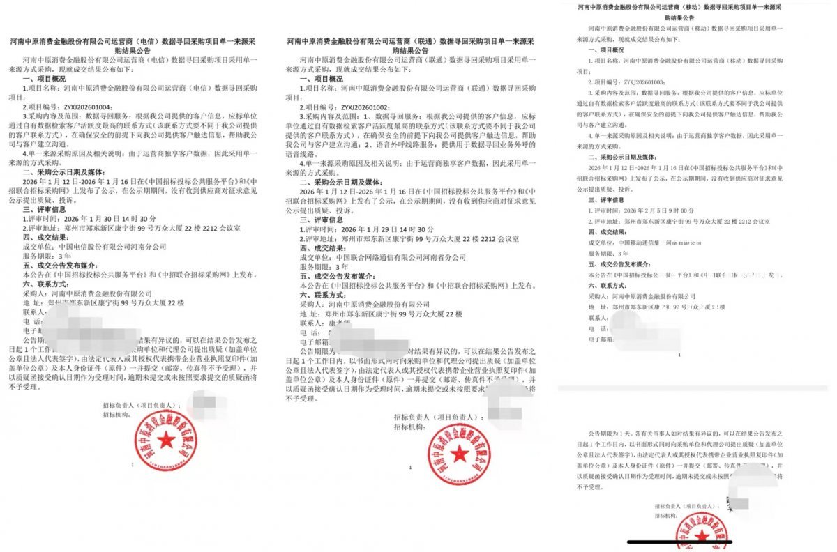 近日,河南中原消费金融股份有限公司(以下简称“中原消费金融”)公开了“运营商数据寻回采购项目”单一来源采购中标结果,移动、联通、电信三大电信运营商均中标。