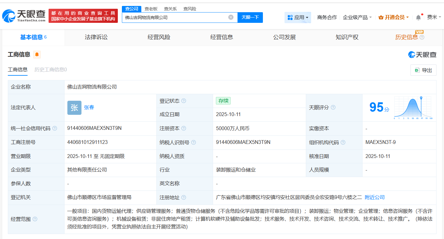 天眼查App显示,近日,佛山吉网物流有限公司成立,法定代表人为张春,注册资本5亿人民币,经营范围包括国内货物运输代理、供应链管理服务、普通货物仓储服务等。