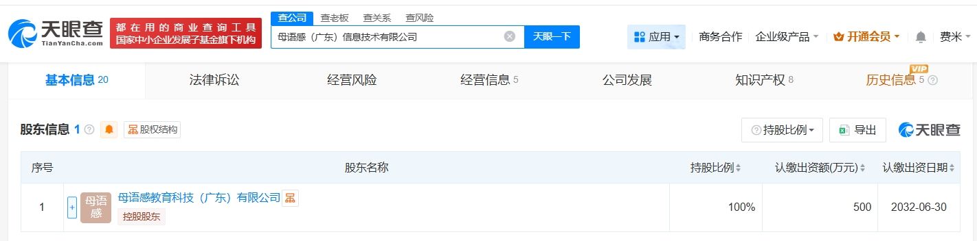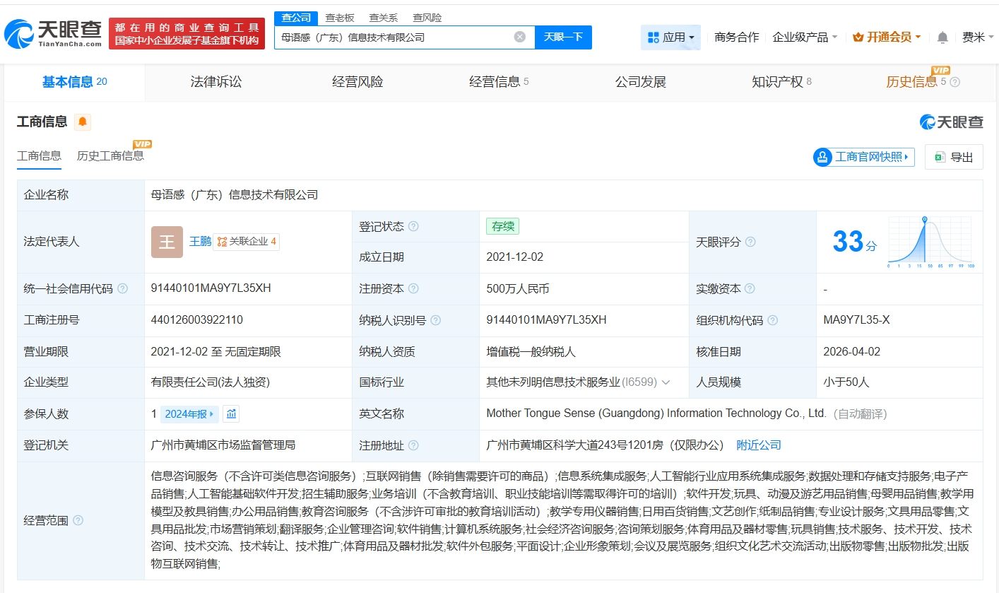 天眼查App显示,母语感启蒙课程关联公司母语感(广东)信息技术有限公司成立于2021年12月,法定代表人为创始人王鹏(自如老师),注册资本500万人民币,由母语感教育科技(广东)有限公司全资持股。变更记录信息显示,近期,该公司经营范围新增出版物零售、出版物批发、出版物互联网销售等业务。