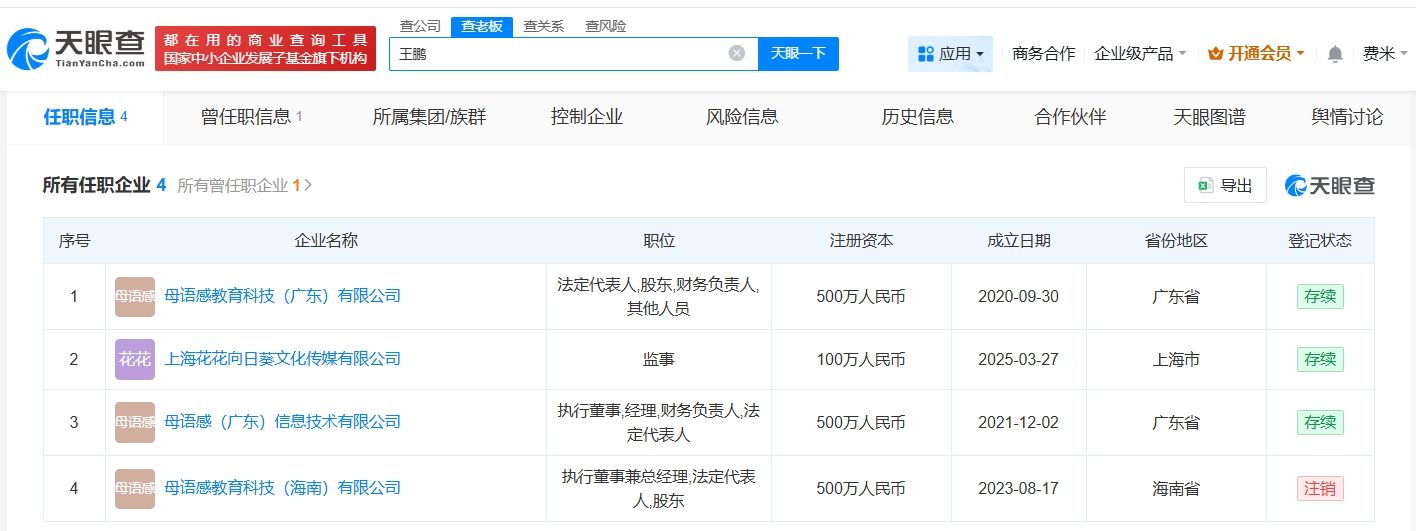 此外,王鹏名下关联4家企业,其中3家处于存续状态,分别是母语感教育科技(广东)有限公司、上海花花向日葵文化传媒有限公司、母语感(广东)信息技术有限公司,王鹏在上述企业担任执行董事、经理等职务。