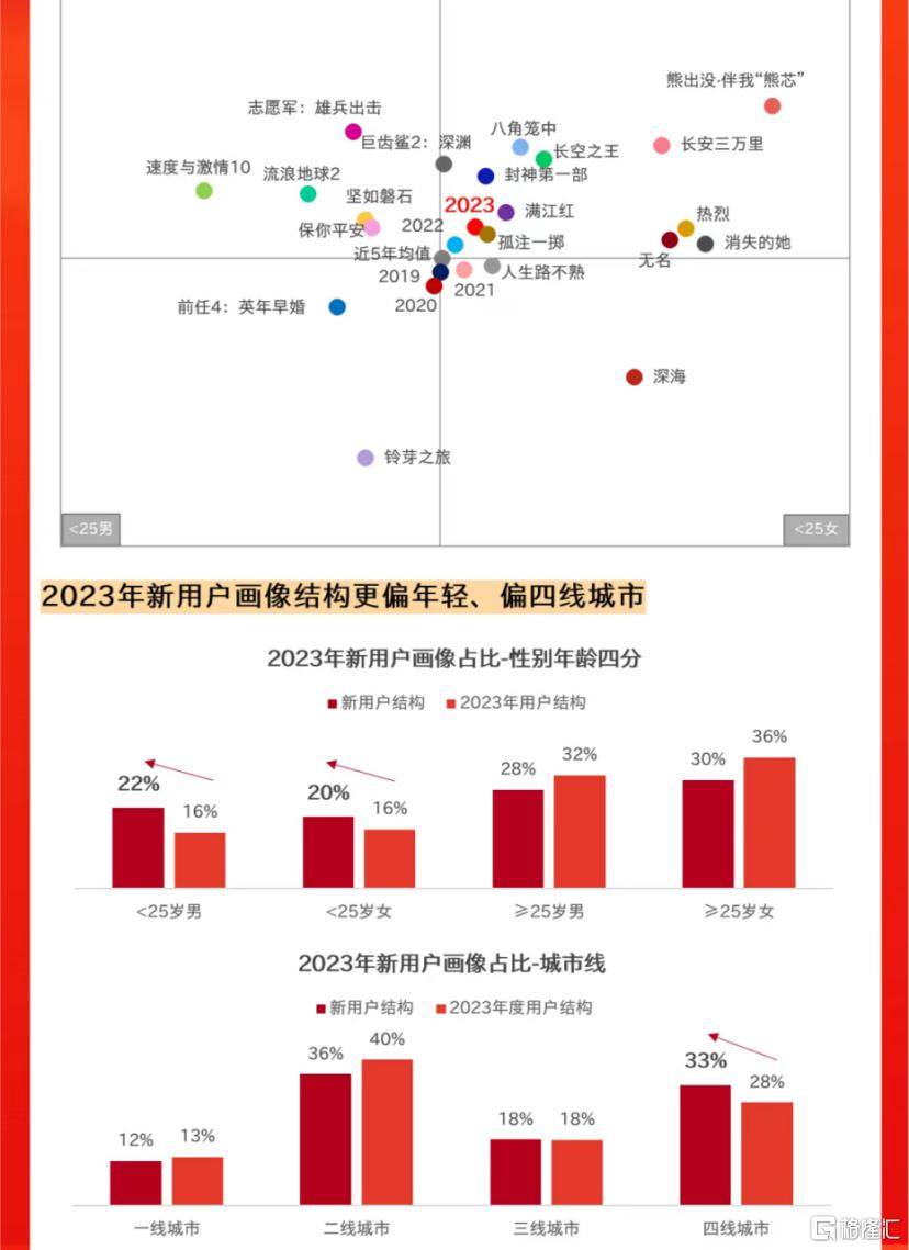 《报告》显示,2023 年各级城市票仓分布总体趋于稳定,但从新用户画像结构来看,新增用户更偏年轻、偏四线城市,下沉市场持续释放消费潜力。与此同时,《熊出没 · 伴我 " 熊心》《长安三万里》《八角笼中》等具有教育及娱乐意义的影片,直观带动家庭多人观影,带动整体购票画像较往年更偏年长女性。