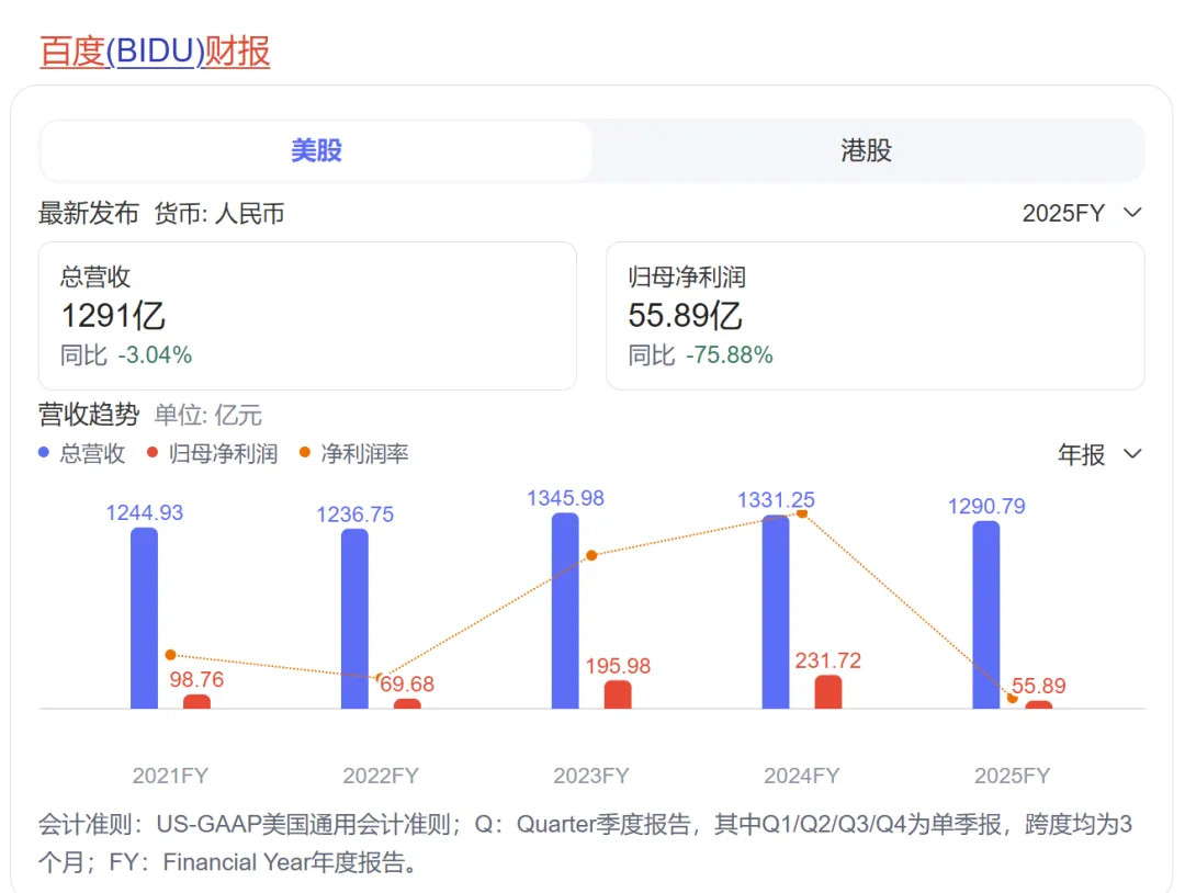 2025年对百度而言,是战略转折与业绩阵痛并存的关键一年。随着2月26日财报的披露,百度交出了一份“喜忧参半”的成绩单:GAAP口径下营收净利双降,股价应声下挫,市场对百度AI转型的耐心正被考验。