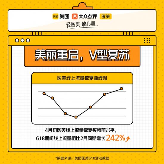 美团医美《618美丽重启消费报告》显示,3月开始,医美逐步呈现复苏趋势,从线上流量看,4月初即已恢复到疫情前水平。618活动期间线上流量比2月同期增长242%,行业呈现明显的“V型复苏”趋势。