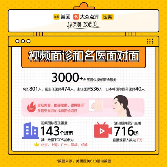 美团医美618期间,共有3000多名医生提供视频面诊服务,覆盖143个城市,数量最多的城市为北京、上海、广州、深圳和成都。皮肤美容、面部轮廓、眼鼻整形是最受欢迎的视频面诊项目。此外,美团医美也在618期间持续利用在线平台打造医美服务新场景,上线716场直播,观看人数超千万。