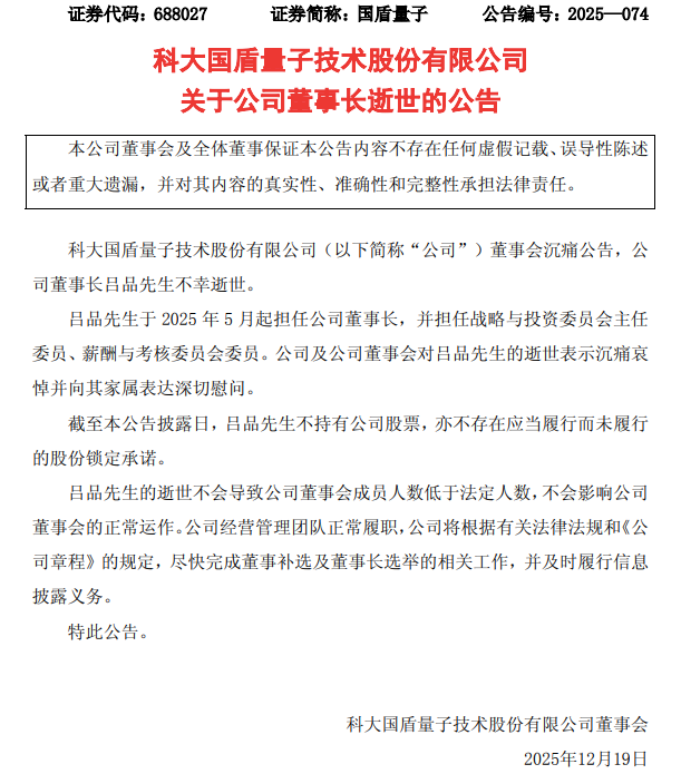 【TechWeb】12月19日消息,国盾量子(688027.SH)公告称,公司董事长吕品于2025年5月起担任公司董事长,不幸于近日逝世。吕品不持有公司股票,其逝世不影响公司董事会运作,公司将尽快完成董事补选及董事长选举工作。