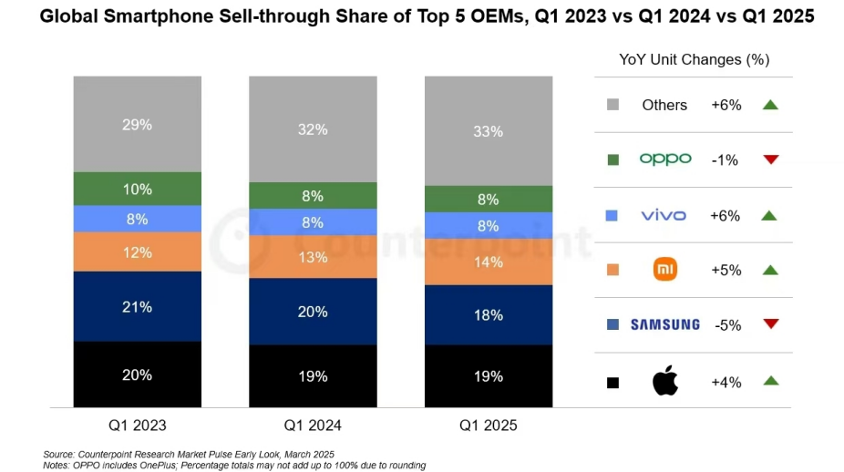 Counterpoint:2025年Q1全球智能手机市占率出炉