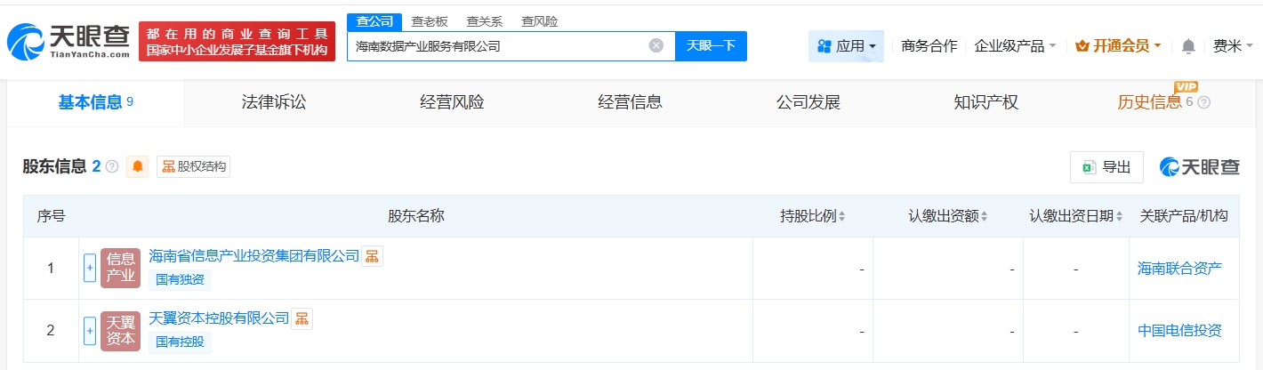 天眼查工商信息显示,近日,海南数据产业服务有限公司成立,法定代表人为陈文思,注册资本1亿人民币,经营范围包括第一类增值电信业务、第二类增值电信业务、互联网直播技术服务、信息网络传播视听节目等。股东信息显示,该公司由中国电信(601728)旗下天翼资本控股有限公司、海南省信息产业投资集团有限公司共同持股。
