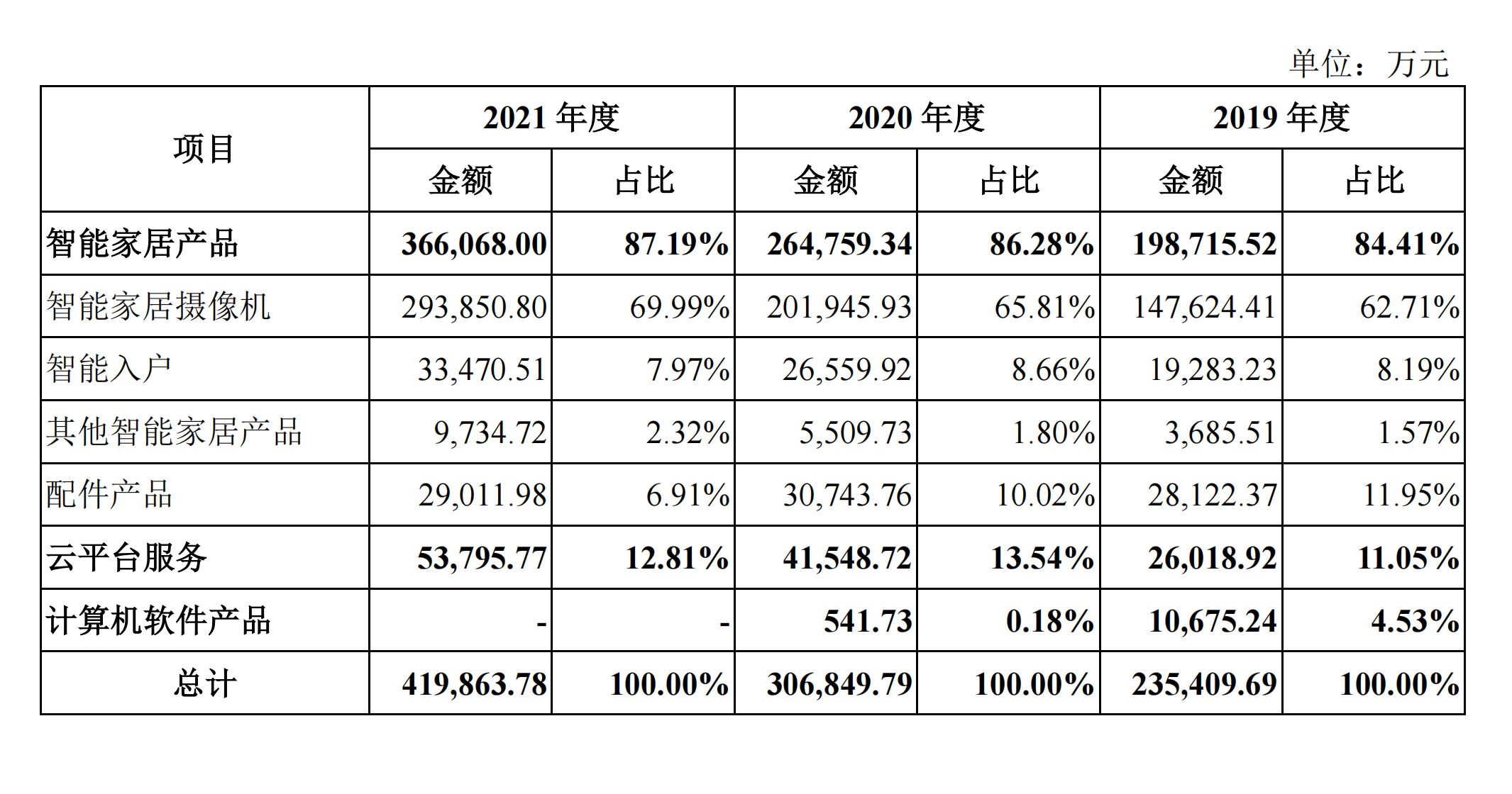 但是,从近期的营收结构来看,萤石网络的路径比起预设的还是出现了少许偏差,大生态还尚未全面开花。根据招股书,2021年萤石网络绝大部分的营收来自智能家居摄像机业务,达29.39亿元,占总营收的比重为69.99%。其次再到云平台服务,营收5.38亿元,占比12.81%。