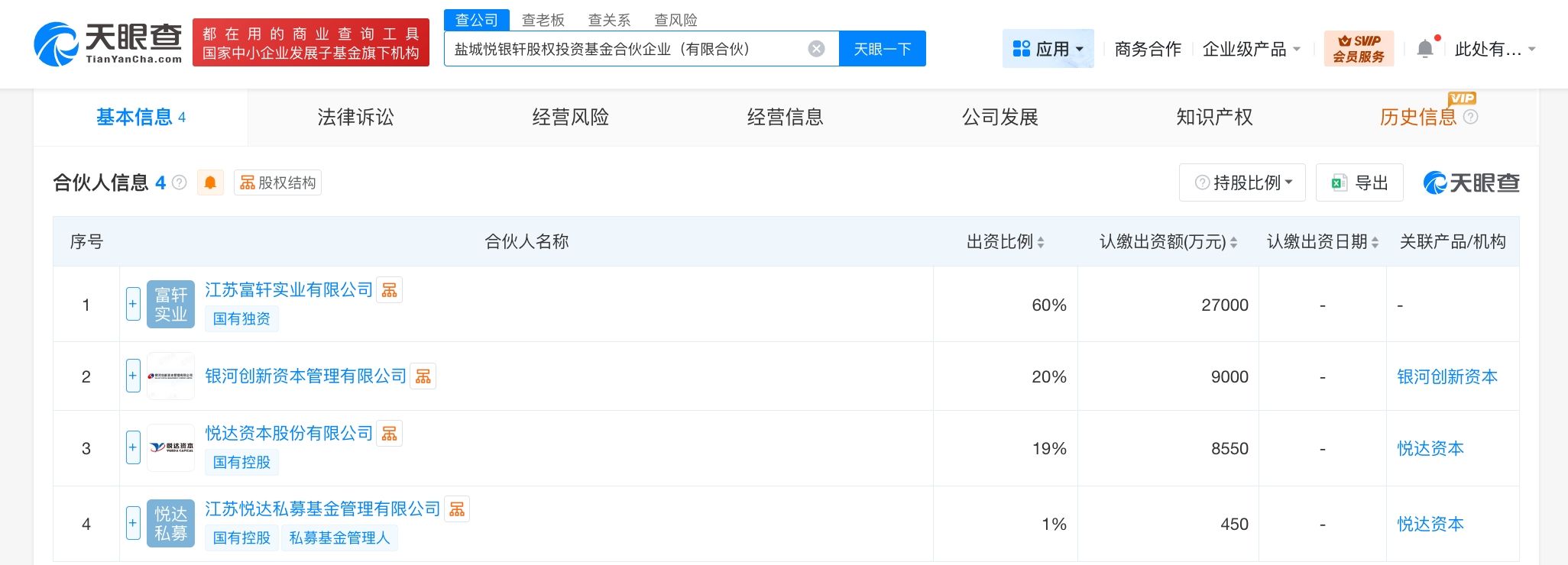 天眼查App显示,近日,盐城悦银轩股权投资基金合伙企业(有限合伙)成立,执行事务合伙人为银河创新资本管理有限公司、江苏悦达私募基金管理有限公司,出资额4.5亿人民币,经营范围为以私募基金从事股权投资、投资管理、资产管理等活动,创业投资。合伙人信息显示,该基金由江苏富轩实业有限公司、银河创新资本管理有限公司、悦达资本股份有限公司、江苏悦达私募基金管理有限公司共同出资。