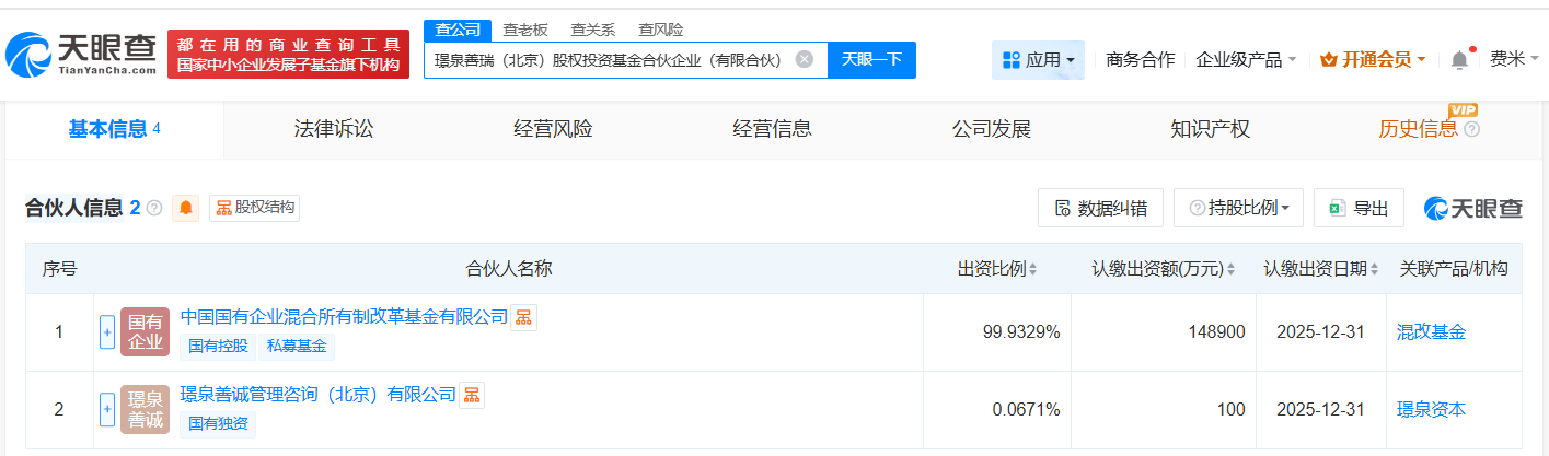 天眼查工商信息显示,近日,璟泉善瑞(北京)股权投资基金合伙企业(有限合伙)成立,执行事务合伙人为璟泉善诚管理咨询(北京)有限公司,出资额14.9亿人民币,经营范围为以私募基金从事股权投资、投资管理、资产管理等活动。合伙人信息显示,该基金由中国国有企业混合所有制改革基金有限公司、璟泉善诚管理咨询(北京)有限公司共同出资。