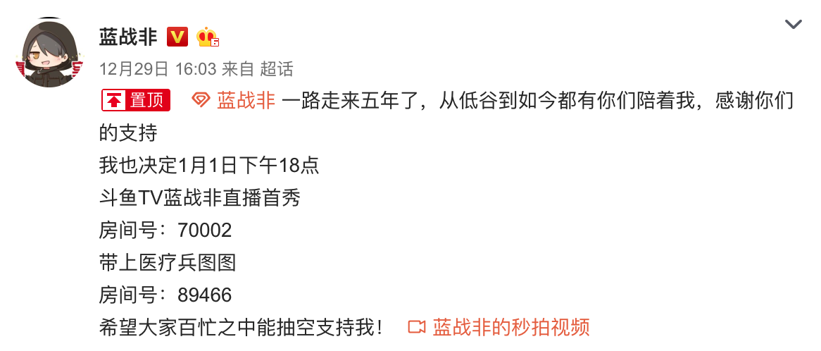 首先是已经停播许久的PDD下一个直播平台似乎已经指向斗鱼。2018年12月份中旬,PDD在个人微博上表示,目前正在处理与熊猫直播平台的债务纠纷;在十二月底,从斗鱼游戏直播发出的新年祝福海报中,眼尖的网友就发现藏有“这波百发百中,我必不可死”的句子,而这是PDD直播时候的经典口头禅。