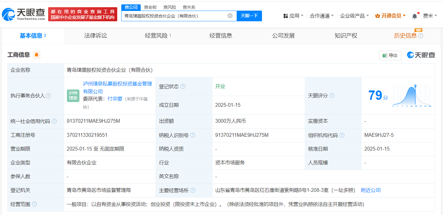 天眼查App显示,近日,青岛璞盛股权投资合伙企业(有限合伙)成立,执行事务合伙人为泸州璞泉私募股权投资基金管理有限公司,出资额3000万人民币,经营范围为以自有资金从事投资活动,创业投资。