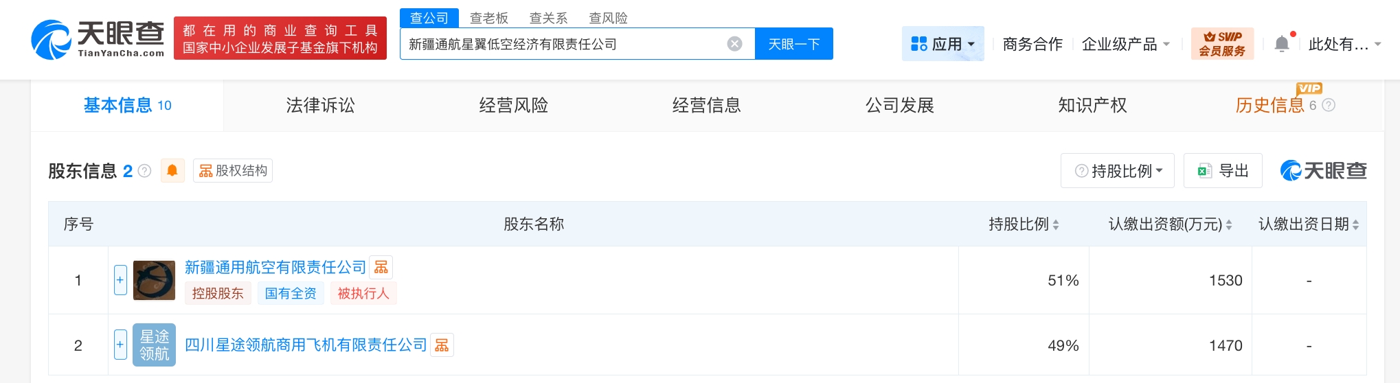 天眼查工商信息显示,近日,新疆通航星翼低空经济有限责任公司成立,法定代表人为秦世健,注册资本3000万人民币,经营范围包括通用航空服务、智能无人飞行器制造、智能无人飞行器销售、通信设备制造、软件开发、数据处理和存储支持服务等。股东信息显示,该公司由新疆通用航空有限责任公司、四川星途领航商用飞机有限责任公司分别持股51%、49%。