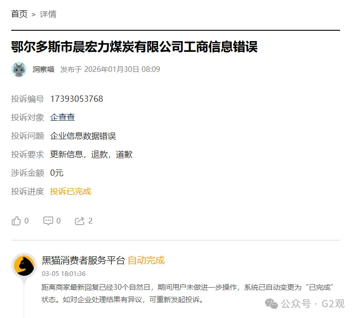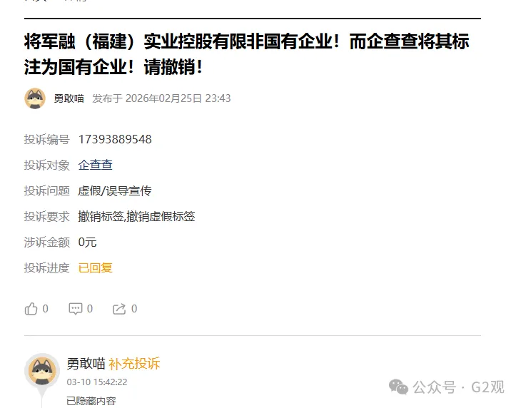 黑猫投诉平台上,有用户称,企查查将其所在公司的标签设置错误,将非国有企业设置成国有企业。