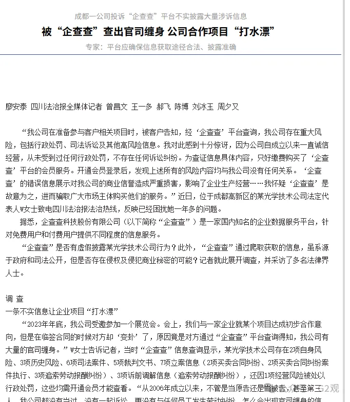 《四川法治报》曾报道,有公司反映企查查在未核实信息真实性的前提下,展示大量与公司无关的负面信息,致使该公司在商业合作中遭受重创,声誉严重受损。这一行为涉嫌构成损害商业信誉、商品声誉罪——其虚假信息传播,对企业的商业信誉造成诋毁,破坏了公平竞争的市场环境,扰乱了正常的经济秩序。