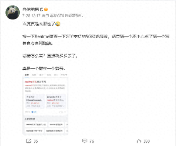 据沈义人透露,他原本只是希望通过百度搜索了解realme真我GT6手机所支持的5G网络频段信息。然而,当他在搜索结果中点击了标有“realme手机官方官网”的第一个链接时,却意外地被跳转到了拼多多平台。这一出乎意料的跳转让沈义人感到十分不满,他用“邪性”一词来形容百度的这一行为,并调侃道:“真是一个敢卖一个敢买。”沈义人的这篇吐槽微博迅速在网络上走红,成为了公众热议的焦点。