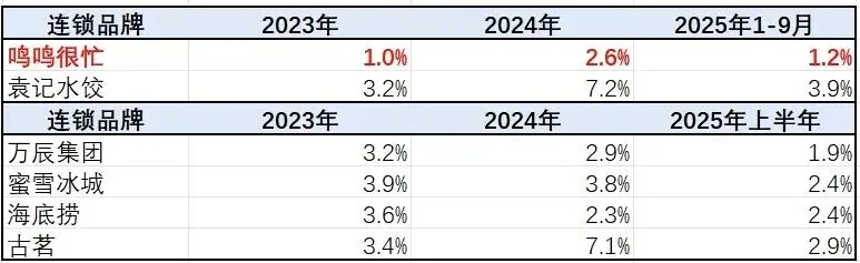 更为直观的痛感来自于“闭店率”。按照行业通用的计算公式(当期关闭门店数 / [(期初门店数+期末门店数)/2]),名创优品在2023年和2024年的闭店率分别为6.7%和7.3%。这两个数字如果单独看或许并不惊人,但若置于头部连锁零售品牌的坐标系中横向对比,名创优品的加盟商流失速度显然偏高。