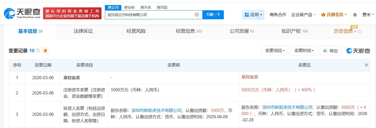 天眼查工商信息显示,近日,武汉启云方科技有限公司发生工商变更,注册资本由1000万人民币增至5000万人民币,增幅400%。