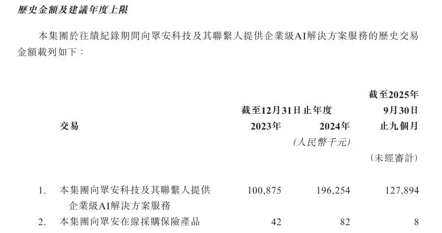 招股书还披露,2025年第四季度关联交易预计将出现暴增。2025年前三季度,众安信科向众安科技及其联系人提供企业级AI解决方案服务的交易额为1.28亿元,而全年交易额预计为2.53亿元。这意味着仅第四季度的交易额就高达1.25亿元,占全年交易额的一半左右。这种在报告期末及临近IPO申报关键时点,出现如此异常的关联交易集中现象,更需要合理解释其商业实质。