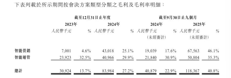 不过,众安信科的毛利率与费用率走势则表现为反常的“双升”态势,这在企业级AI解决方案行业中也较为罕见。在毛利率方面,公司整体毛利率从2023年的13.7%攀升至2024年的27.2%,2025年前三季度进一步飙升至40.8%。其中,智能营销解决方案毛利率更是从2023年的4.6%暴增至2025年前三季度的46.1%,两年内涨幅超40个百分点。