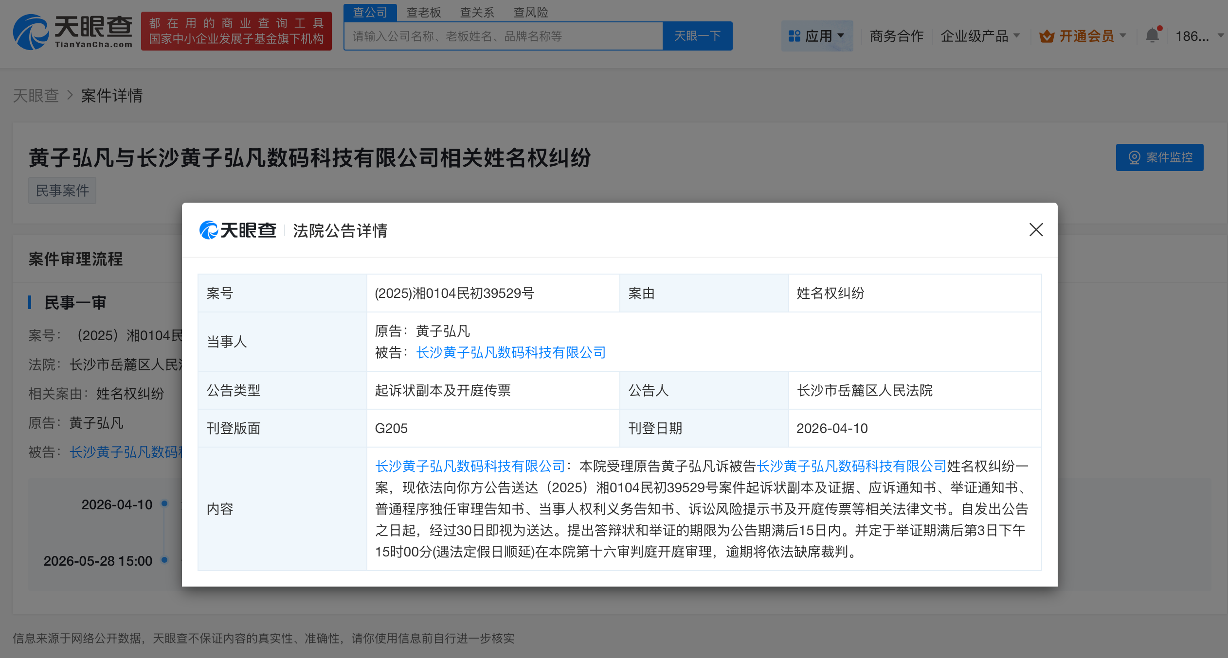 天眼查法律诉讼信息显示,近日,长沙市岳麓区人民法院向长沙黄子弘凡数码科技有限公司公告送达黄子弘凡与其姓名权纠纷一案起诉状副本及证据、开庭传票等。自发出公告之日起,经过30日即视为送达,并定于举证期满后第3日下午15时开庭审理。