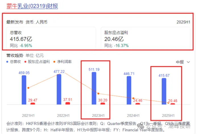 蒙牛最新中期财报显示,2025年上半年营收415.7亿元,同比下滑6.9%,净利润更同比下降16.4%。这已是蒙牛连续两年陷入“营利双降”的尴尬境地。