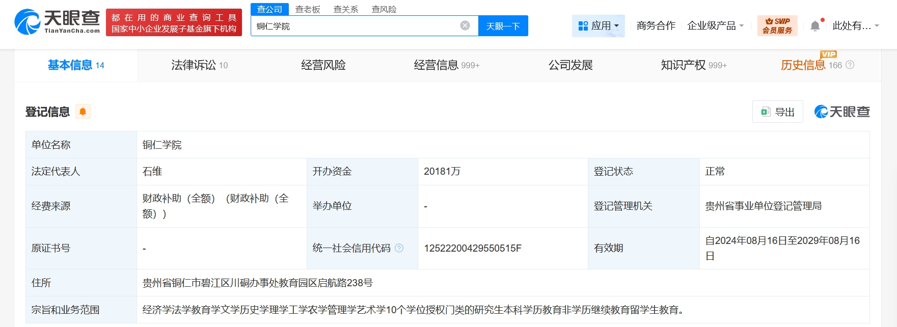 天眼查App显示,铜仁学院法定代表人为石维,开办资金约2亿人民币,宗旨和业务范围为经济学、法学、教育学、文学等10个学位授权门类的研究生、本科学历教育,非学历继续教育,留学生教育。对外投资信息显示,该学院直接持股贵州铜院科技发展有限公司。风险信息显示,今年9月,该学院新增一则被执行人信息,执行标的450万元。