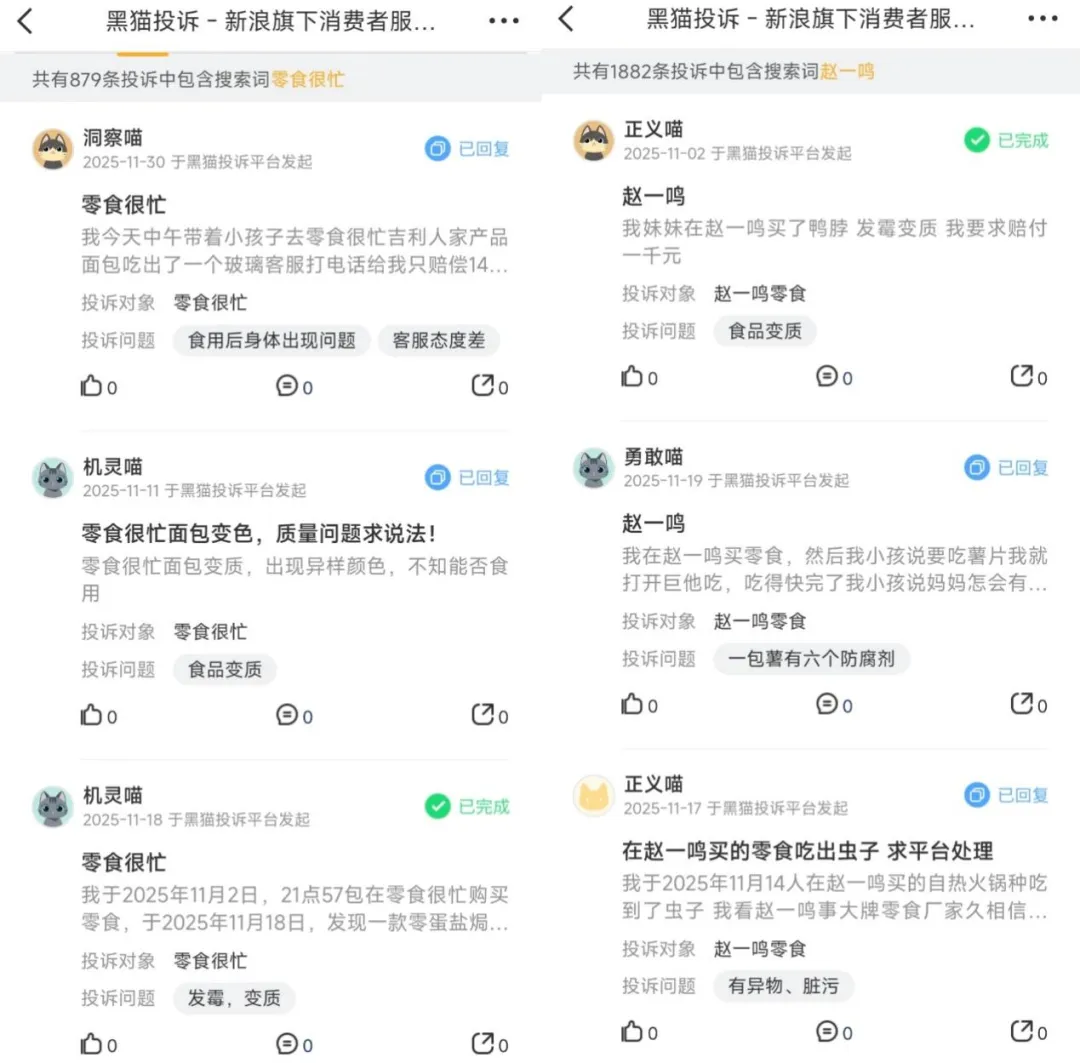 在黑猫投诉平台上,截至目前,关于“零食很忙”相关投诉共有879条,关于“赵一鸣”零食相关投诉共有1882条,投诉内容包括食品有异物、发霉、变质,商品价格欺诈、假称,服务员态度恶劣、售后处理滞后、拒绝赔偿,涵盖从产品质量到销售过程以及售后服务等各个环节。