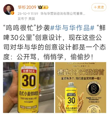 除了屡屡被爆食品安全问题,鸣鸣很忙还陷入抄袭风波之中,面临着品牌声誉的考验。2025年10月9日,华与华营销咨询有限公司董事长华杉发文称,“鸣鸣很忙”抄袭“华与华”作品“鲜啤30公里”创意设计,并指出当前部分公司对“华与华”的创意设计普遍持“公开骂、悄悄学、偷偷抄”的态度。